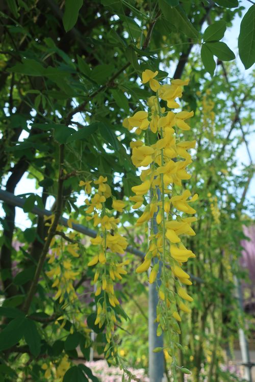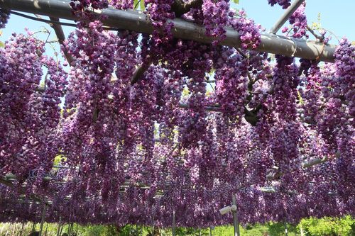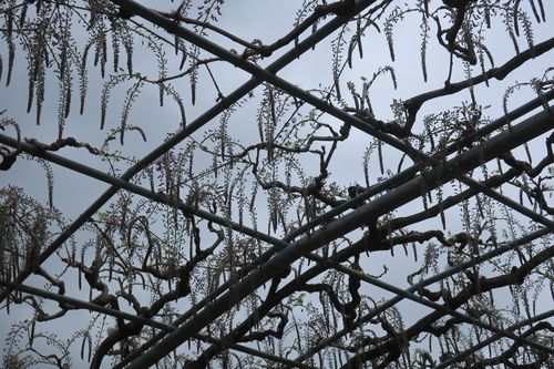 八重黒龍藤の棚です。花房が短い品種ですので、同じ棚の中でも光の濃淡を感じやすいかもしれません。