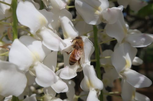 白藤をよく見るとお花の真ん中が黄色く染まっています。この黄色で昆虫達を「私の所に来てー!」と呼んでいるのです。