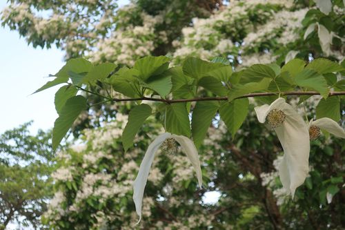 手前は「ハンカチノキ」と奥に「ヒトツバタゴ」