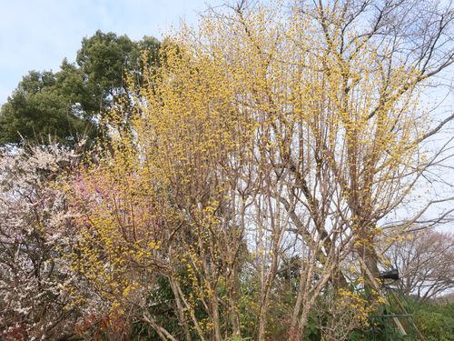 ロウバイからバトンタッチするように黄色い花を咲かせており、山側ではウメと共に楽しむことができますよ。
