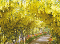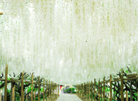 藤と言えば日本古来の花木と言われ、万葉集にも歌われています。その日本を代表する原種・野田藤、色ごとに、うす紅、むらさき、白と順に藤色が移りゆきます。最後は日本では栽培が難しいと言われているきばな藤(マメ科キングサリ属)が見頃を迎え、1ヶ月以上も藤の花がお楽しみいただけます。 樹齢160年におよぶ600畳敷の大藤棚3面と世界でも珍しい八重の大藤棚、庭木仕立ての藤、80m続く白藤のトンネル、きばな藤、そしてスクリーン仕立ての藤、夜には池に映る水鏡の藤と、息を呑むほどの美しさです。移送の上、植栽した当時は72㎡の藤棚は10倍以上の1,000㎡にも拡がり、世界一美しい藤と言われるほどになりました。 この生命力と美しく華やかな世界をお楽しみいただければと存じます。