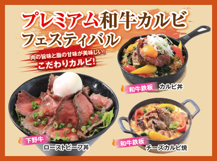 旨みたっぷりの下野牛を使用したローストビーフ丼に加え、味と質にこだわって厳選したプレミアムカルビを鉄板焼きでご用意しました。アフタヌーンティーセットで優雅なひとときを過ごすのもおすすめです。